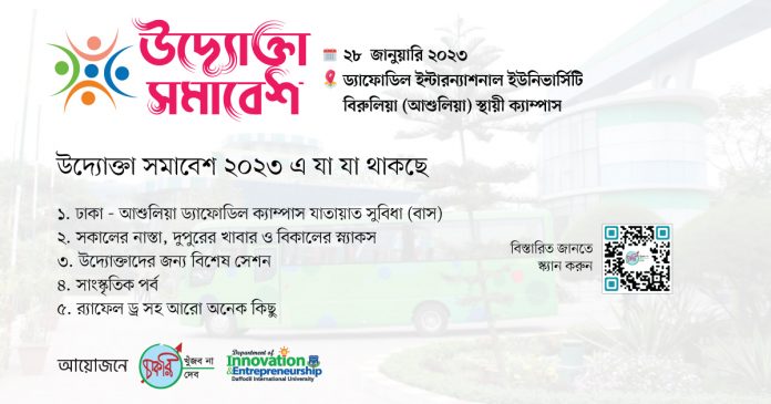 বাংলাদেশ ওপেন সোর্স নেটওয়ার্ক (বিডিওএসএন)-এর উদ্যোক্তা বিষয়ক প্ল্যাটফর্ম চাকরি খুঁজব না চাকরি দেব এবং ড্যাফোডিল ইন্টারন্যাশনাল ইউনিভার্সিটির ডিপার্টমেন্ট অব ইনোভেশন অ্যান্ড অন্ট্রাপ্রেনিউরশিপ-এর যৌথ আয়োজনে অনুষ্ঠিত হবে ‘উদ্যোক্তা সমাবেশ-২০২৩’।