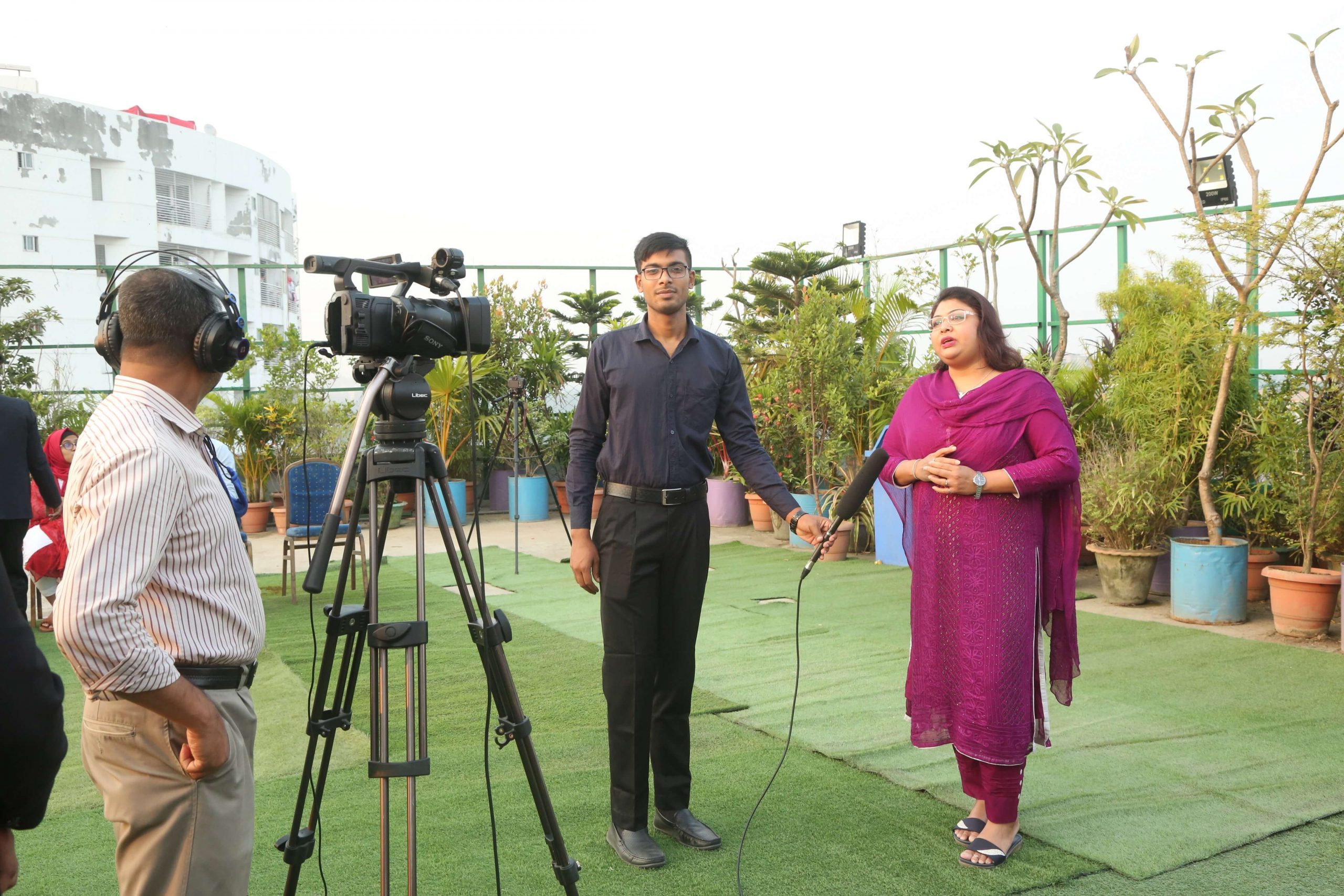 লোগো বোর্ডের সামনে বিডিওএসএনের সাধারণ সম্পাদক মুনির হাসান, ড্যাফোডিল ইউনিভার্সিটির আন্ট্রাপ্রেনিওরশিপ বিভাগের শিক্ষক মৃত্তিকা শীল ও এফএম প্লাস্টিকের প্রতিষ্ঠাতা গাজী তৌহিদুর রহমান