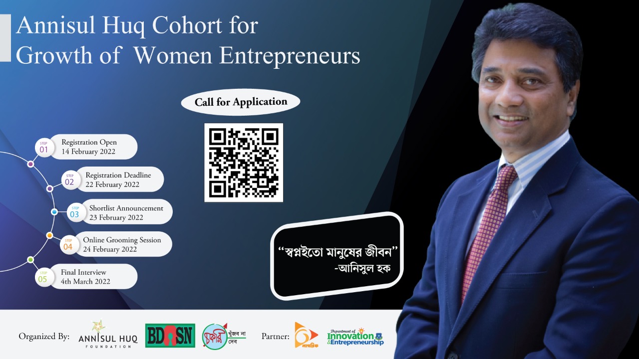 দেশের উদীয়মান নারী উদ্যোক্তাদের ব্যবসা বড় করার পরিকল্পনায় সহযোগিতা করার জন্য শুরু হচ্ছে ৭ মাস মেয়াদি কার্যক্রম। ঢাকা উত্তর সিটি কর্পোরেশনের প্রয়াত মেয়র আনিসুল হক এর নামানুসারে ‘আনিসুল হক কো-হর্ট ফর গ্রোথ অফ উইমেন অন্টাপ্রেনিউরস’ নামের কার্যক্রমটি যৌথভাবে বাস্তবায়ন করবে আনিসুল হক ফাউন্ডেশন, বাংলাদেশ ওপেন সোর্স নেটওয়ার্ক (বিডিওএসএন) ও চাকরি খুঁজব না চাকরি দেব গ্রুপ।