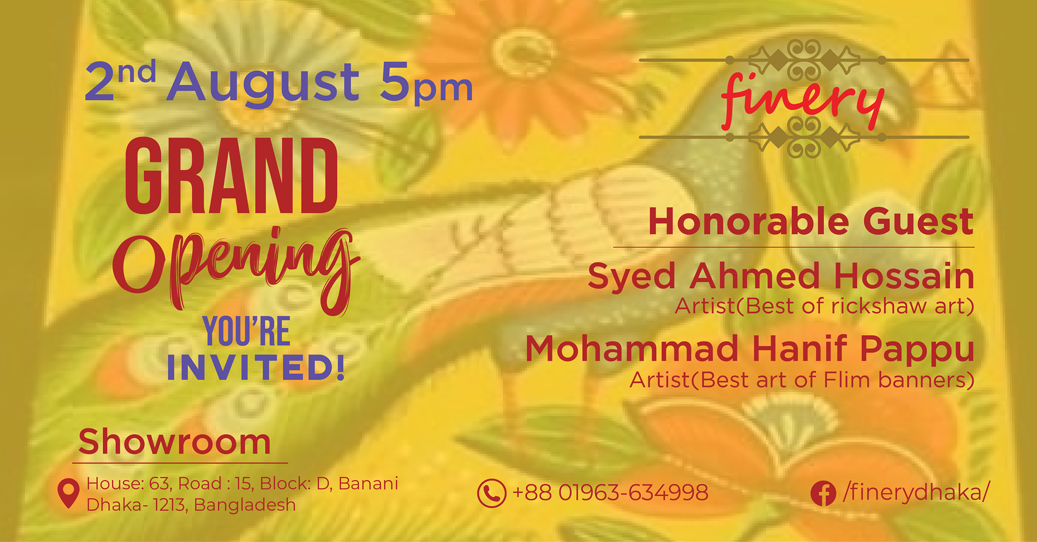 আগামী ২ আগস্ট (শুক্রবার) বিকেল ৫.০০ টায় ফিনারী’র প্রথম আউটলেট “শুভ উদ্বোধন” হবে। অনুষ্ঠানে অতিথি হিসেবে থাকবেন আন্তর্জাতিক অঙ্গনে বাংলাদেশের রিক্সা আর্ট পরিচয় করিয়ে দেয়া শিল্পী সৈয়দ আহমাদ হোসাইন ও সিনেমা পোষ্টারের জীবন্ত কিংবদন্তি মোহাম্মদ হানিফ পাপ্পু।এটি সবার জন্য উন্মুক্ত।