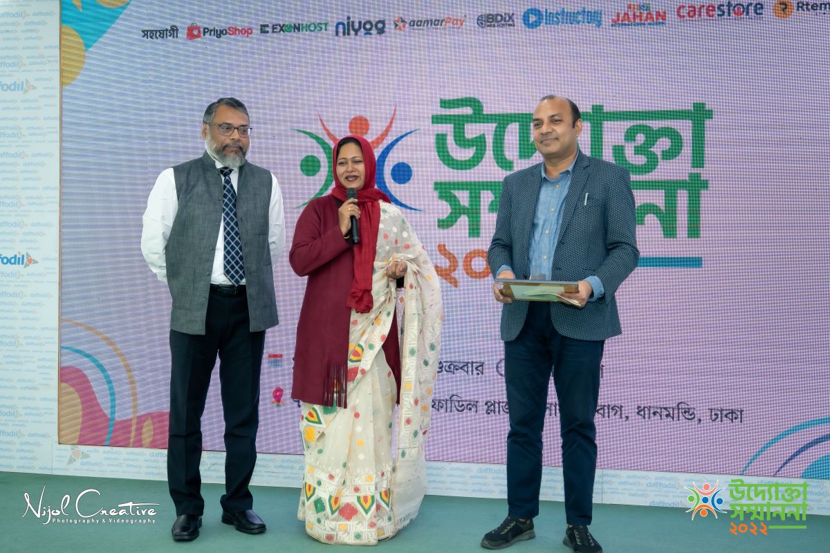 উদ্যোক্তা সম্মাননা ২০২২ প্রাপ্ত উদ্যোক্তা মাসুমা খাতুন অভিব্যাক্তি প্রকাশ করছেন, ছবিতে বা পাশে তাঁর স্বামী এবং ছবির ডান পাশে ড্যাফোডিল ইন্টারন্যাশনাল ইউনিভার্সিটির বিজনেস অ্যান্ড ইনোভেশন ফ্যাকাল্টর ডিন অধ্যাপক মাসুম ইকবাল। ছবি: নিজল ক্রিয়েটিভ