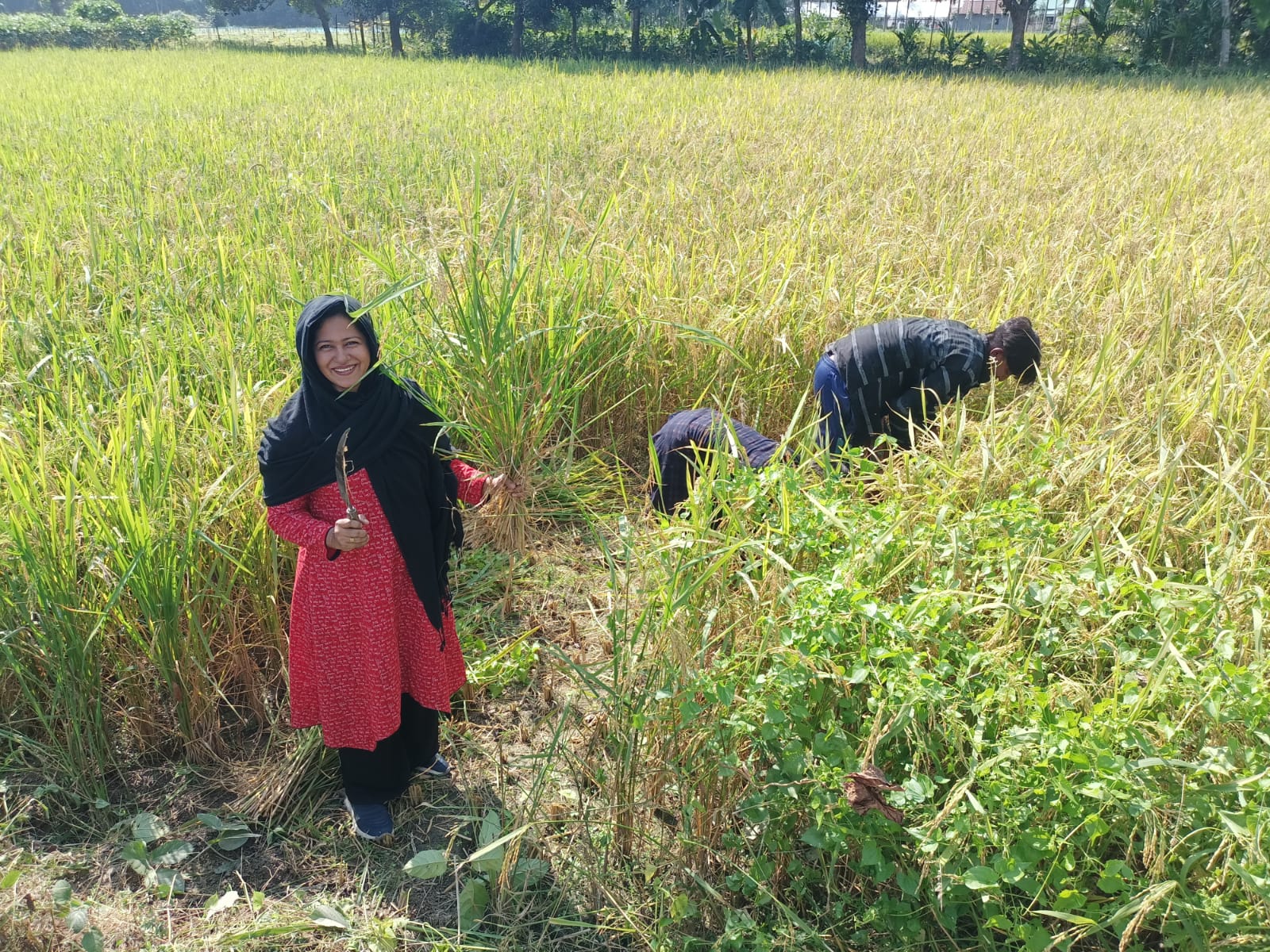 কৃষি জমিতে ফসল পরিদর্শন করছেন মাদলের উদ্যোক্তা মাসুমা খাতুন। ছবি: সংগৃহিত