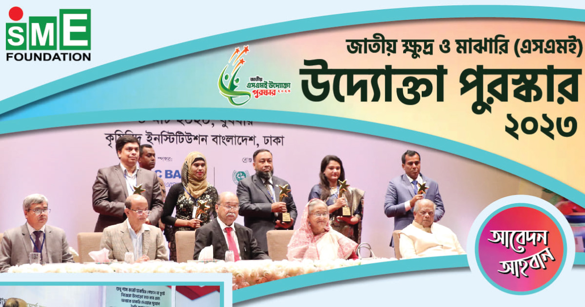 জাতীয় এসএমই উদ্যোক্তা পুরস্কার ২০২৩ এর জন্য সারা দেশের উদ্যোক্তাদের নিকট হতে আবেদন আহবান করা যাচ্ছে। আগ্রহী উদ্যোক্তাগণ যেকোন একটি ক্যাটাগরিতে আবেদন করতে পারবেন। আবেদনপত্রসহ বিস্তারিত তথ্য এসএমই ফাউন্ডেশনের ওয়েবসাইট (www.smef.gov.bd) এবং ভেরিফাইড ফেসবুক পেইজ (SME Foundation), এসএমই ফাউন্ডেশন ও ইনস্টিটিউট অব এসএমই ফাউন্ডেশন (জহির স্মার্ট টাওয়ার, ২০৫/১/এ, বেগম রোকেয়া সরণি, ঢাকা) এর কার্যালয়ে পাওয়া যাবে। আবেদনপত্র যথাযথভাবে পূরণ করে সংশ্লিষ্ট ডকুমেন্টসহ ১০ সেপ্টেম্বর ২০২৩ রবিবার এর মধ্যে অনলাইন, ই-মেইল (info@smef.gov.bd) অথবা ফাউন্ডেশন কার্যালয়ে সরাসরি প্রেরণ করতে হবে। আবেদন যথাযথভাবে পূরণ না হলে অথবা আবেদনের সাথে প্রয়োজনীয় তথ্য ও ডকুমেন্টস দাখিল করা না হলে আবেদন বাতিল বলে গণ্য করা হবে।