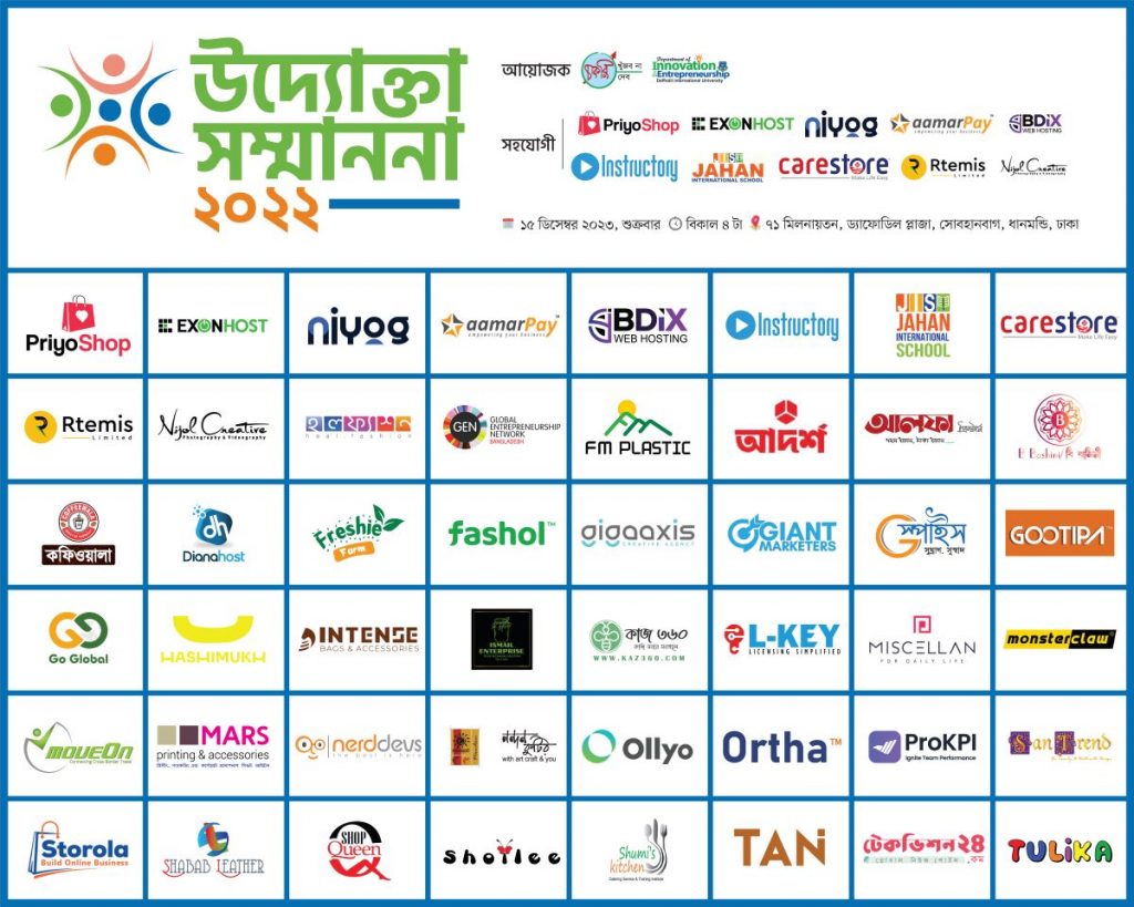গতকাল শুক্রবার ঢাকার ড্যাফোডিল প্লাজার ৭১ মিলনায়তনে বাংলাদেশ ওপেন সোর্স নেটওয়ার্ক (বিডিওএসএন)-এর উদ্যোক্তা বিষয়ক কার্যক্রম চাকরি খুঁজব না, চাকরি দেব এবং ড্যাফোডিল ইন্টারন্যাশনাল ইউনিভার্সিটির ইনোভেশন অ্যান্ড অন্টারপ্রিনিউরশিপ ডিপার্টমেন্টের যৌথ উদ্যোগে দশমবারের মতো তরুণ উদ্যোক্তাদের সম্মানিত করা হয়। এবার ১৯ জন উদ্যোক্তাকে এই সম্মাননা দেয়া হয়।